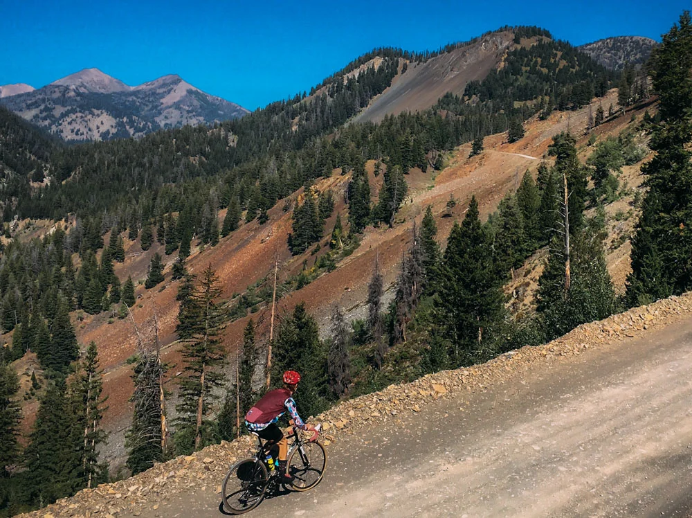 After rolling into Ketchum, Idaho in the middle of the night and hastily making camp, we woke up to a sunny and smoke-free autumn morning, eager to get caffeinated, kitted up, and on our bikes. Without time to do the whole 120-mile loop, we decided to do a 50-ish mile out-and-back on the route of Rebbecca's Private Idaho, over Sun Valley Road and into the valley to the northeast. Just like all things Ketchum, the road leading north out of town was nothing short of posh, with gently curving rollers, smooth pavement, and inviting views of the mountain landscape, just beyond mansions and lush golf course fairways. The easy times didn't last long. After a couple miles, we were reminded that this was rugged and remote northern Idaho. The road pitched up to over 8% and turned to gravel, traversing the shady east side of a dramatic mountain cut, with the opposing, west side of the cut beginning to glow in brilliant morning sunlight.