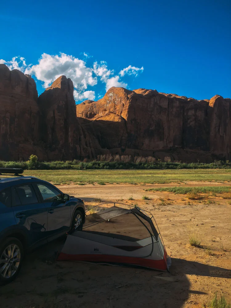 I’ll preface this day of spectacular riding around Moab with a recap of the 24-hours leading up to the ride. I was alone, having dropped Bennett off in Denver so he could fly back to Portland for work, and I spent the day driving from Denver to Moab. I was anxiously trying to get to Moab by late afternoon so I could set up camp and do a short ride out Kane Creek road to keep my legs moving and catch the sunset. By 5:00pm I was making my way through Moab, following Bennett’s detailed directions to “turn right at the McDonalds, and stay on that road until you hit the campground.” Unfortunately, this first campground was full so I continued down the road another mile or so until I came across the next. I stopped to read the campground sign, which displayed two camping options: “premium” and “budget”. The premium sites featured a picnic table, fire ring, and nice shade trees for $35 a night. Not my idea of premium amenities, but I suppose when compared to their budget option, they were. The budget sites were located in a large, mostly dirt field, with no table, no fire ring, no shade or protection from the wind, and the option to set up camp anywhere you pleased for a cool $20 a night. Due to my lack of familiarity with the area and in my haste to get riding, I decided it was good enough, and started to set up camp using my car to block the wind and dust.